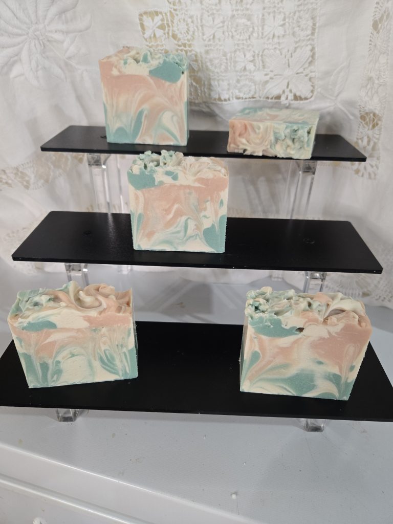 One Lavender soap and two smaller soaps scented with Orange Essential and Lavender sage fragrance oil.